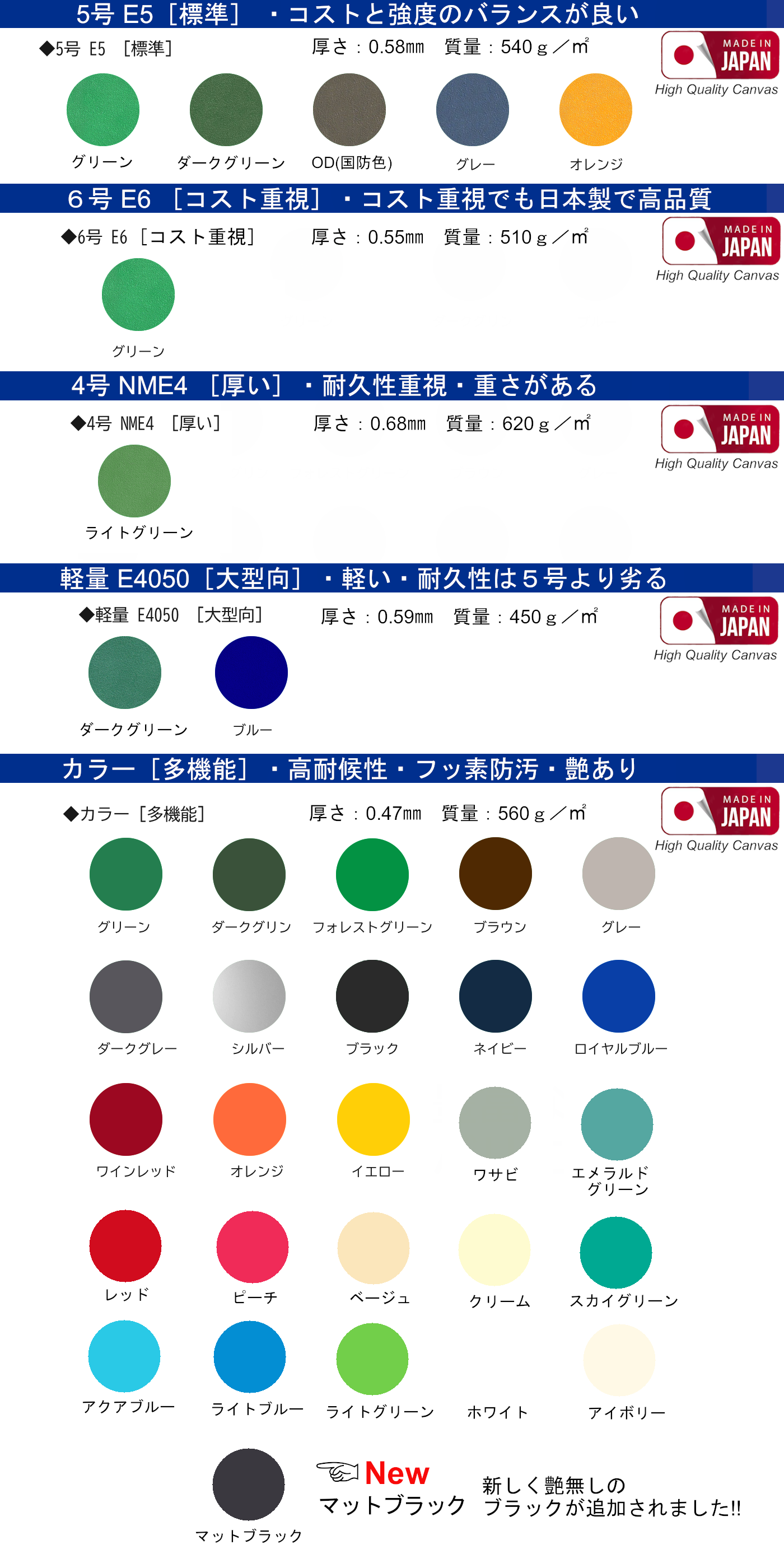 フッ素防汚、カット面からの吸水防止加工、UVカット、耐久7年、防炎、表面フラットの多機能帆布です。カラーが豊富で色味も鮮やかです。